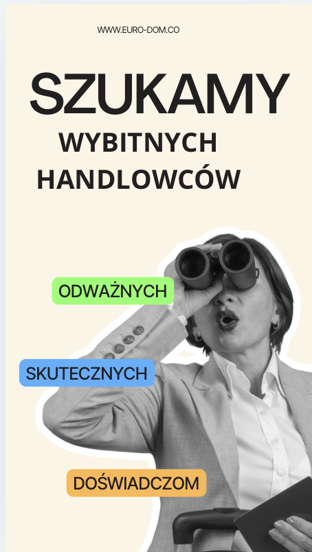 Na tej podstronie znajdziesz informacje dotyczące możliwości rozwoju zawodowego w agencji nieruchomości euro-dom.co. Jesteśmy firmą poszukującą nowych pracowników, którzy chcą dołączyć do naszego zespołu i rozwijać się w branży nieruchomości. Oferujemy atrakcyjne warunki zatrudnienia oraz możliwość zdobycia cennego doświadczenia w pracy z klientami i nieruchomościami. Jeśli jesteś ambitny, komunikatywny i zainteresowany karierą w branży nieruchomości, zapraszamy do zapoznania się z naszą ofertą pracy i dołączenia do naszego zespołu.