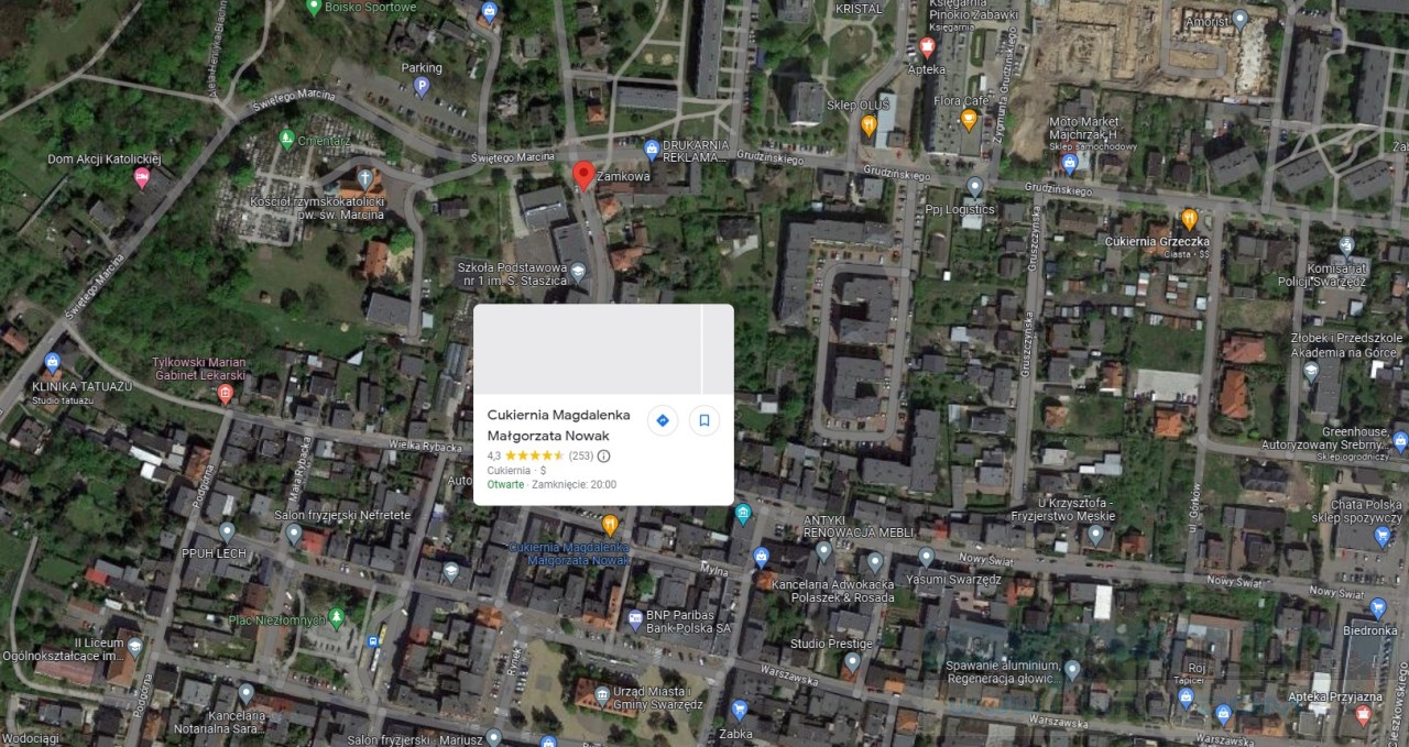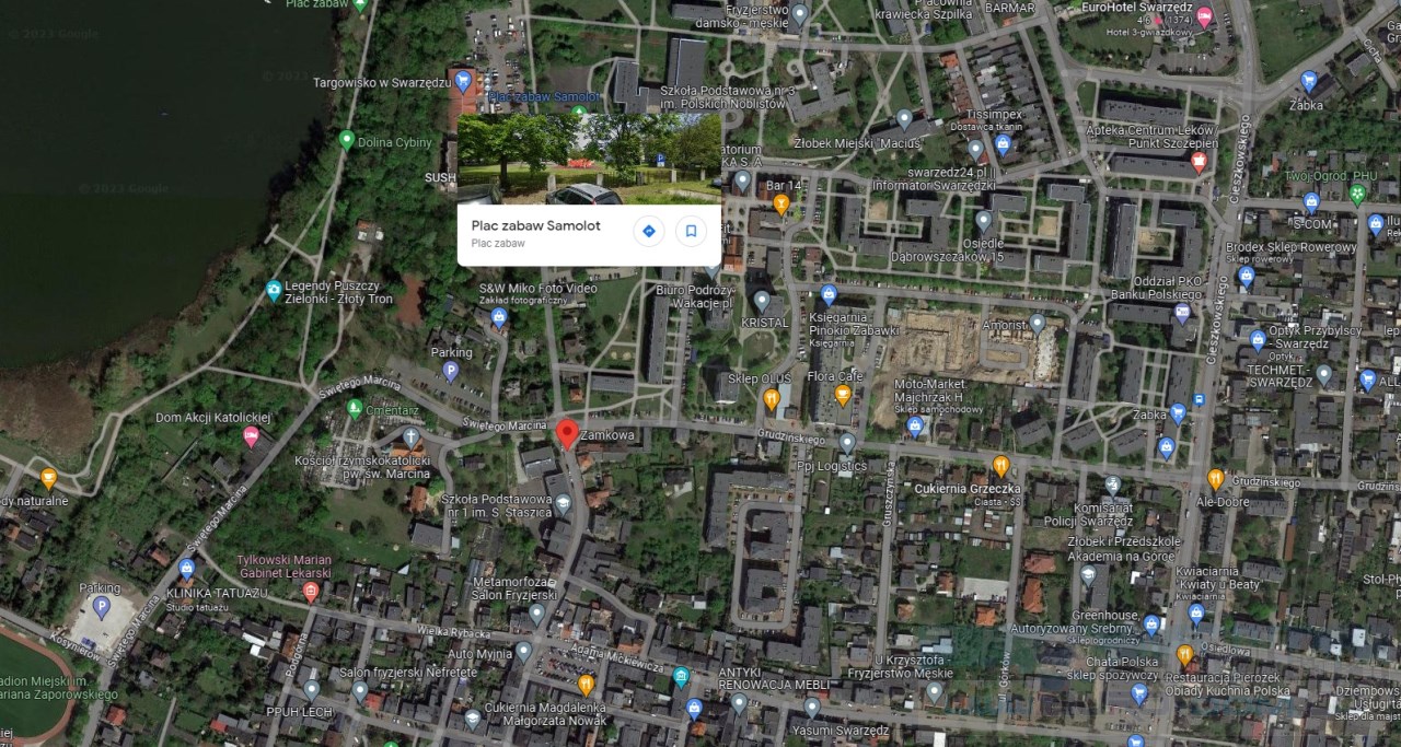 Mieszkanie znajduje się w centrum Swarzędza przy ulicy Zamkowej. W pobliżu jest przystanek autobusowy «Swarzędz/Rynek» (250 m) linii 405, 406, 412, 484, 485, 486, 490, 491, 492, 493, 494, 498, sklep Biedronka (650 m), obiekty sportowe, pływalnia, siłownia, liczne restauracje i kawiarnie, przedszkole nr 8, szkoła podstawowa 1. Blisko jest jezioro Swarzędzkie.