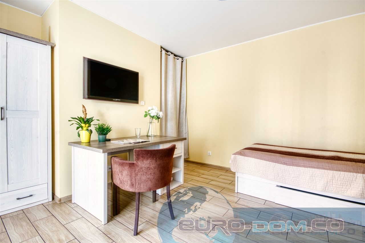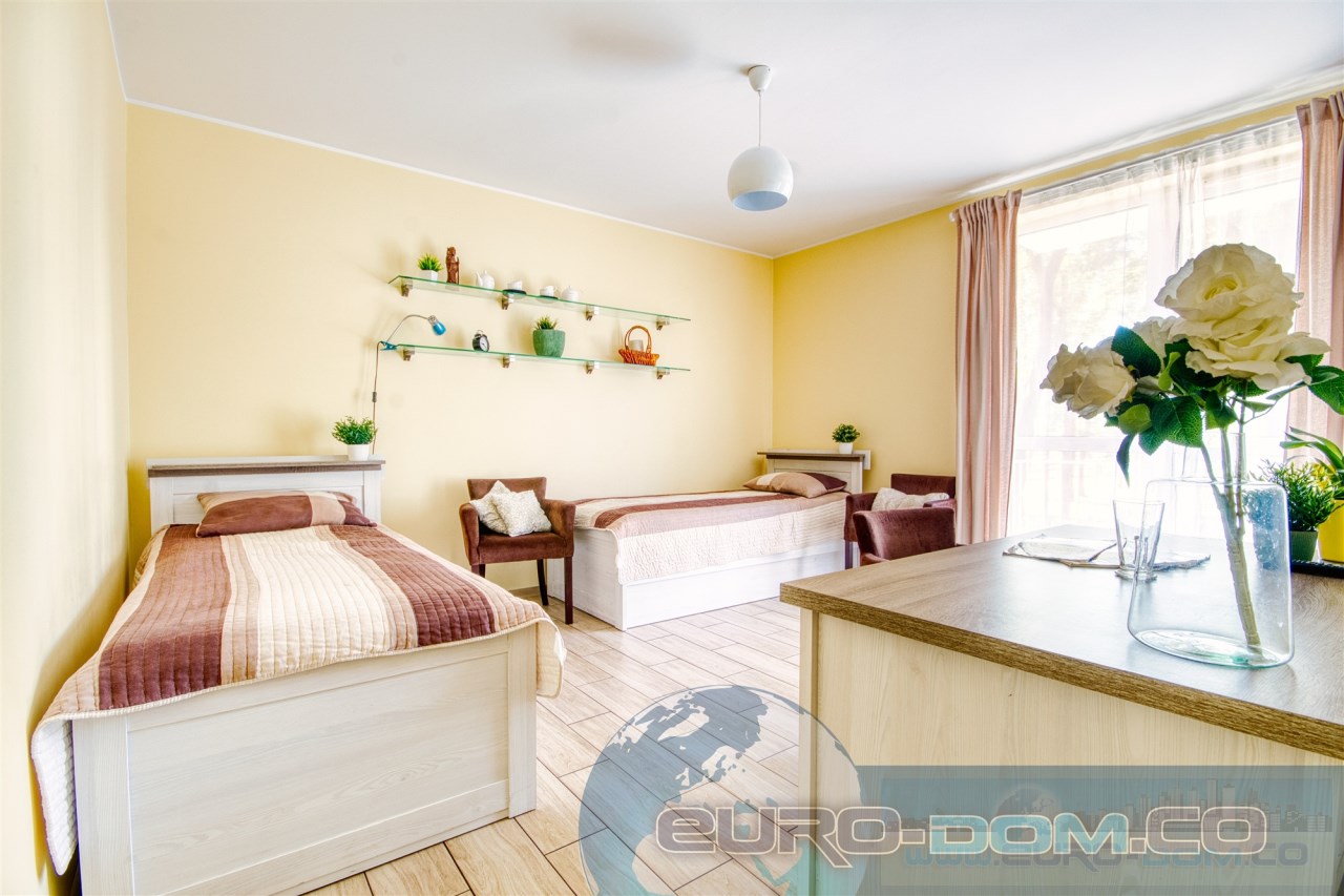 Mieszkanie jest w pełni umeblowane – gotowe do zamieszkania od zaraz. Na wyposażeniu znajduje się m.in. dwa osobne łóżka z możliwością ich połączenia w jedno duże, szafa, stolik, trzy fotele oraz nowoczesne meble kuchenne i łazienkowe. Dodatkowym atutem jest ogrzewanie podłogowe, które zapewnia komfort nawet w chłodniejsze dni.