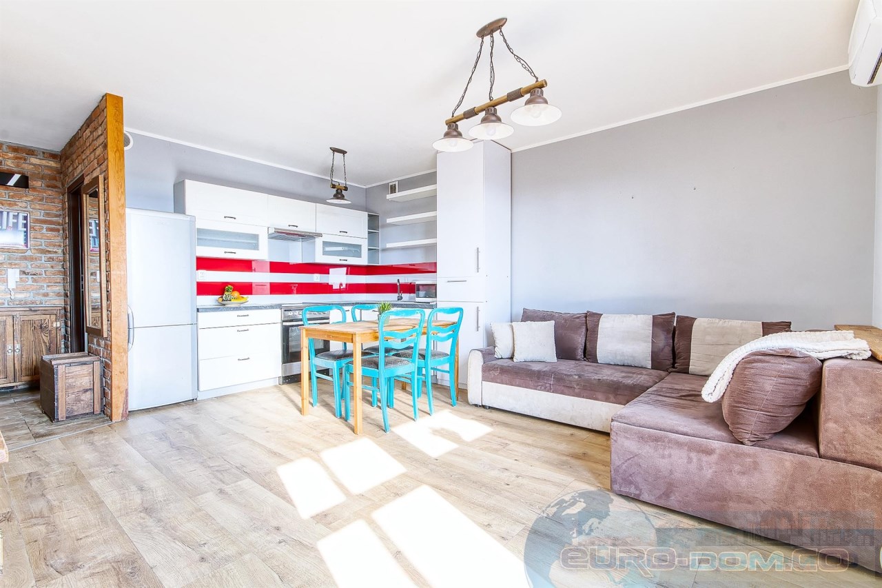 W pełni wyposażona kuchnia (sprzęty AGD zmywarka, płyta grzewcza, piekarnik, lodówka z zamrażalnikiem) połączona z salonem w skład, którego wchodzi zestaw wypoczynkowy, szafka RTV z miejscem na telewizor. W salonie znajduję się również stół z 4 krzesłami. Całość nowoczesna, estetyczna i komfortowa.