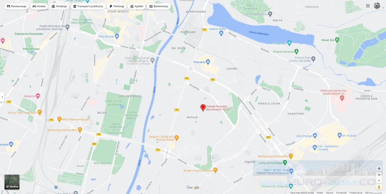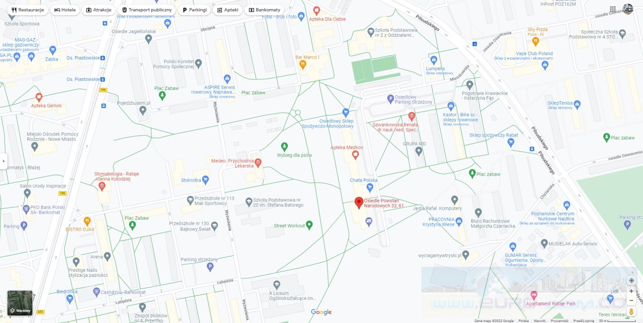 Mieszkanie jest położone w pobliżu centrum handlowego Posnania. Dodatkowo na osiedlu znajdują się sklep Chata Polska i wiele innych sklepów usługowych jak i restauracji. W niedalekiej odległości znajduję się dużo terenów zielonych, siłownia zewnętrzna, a Jezioro Malta znajduję się 2 km od osiedla. Jest to idealna propozycja dla osób ceniących spokój i wygodę. W niedalekiej odległości znajduję się przystanek tramwajowy Os Piastowskie oraz przystanek autobusowy Os. Oświecenia.