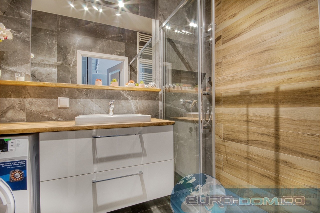 Łazienka – zaprojektowana z myślą o komforcie: nowoczesny prysznic Walk-in z odpływem liniowym, duże lustro, dwie szafki do przechowywania, pralka oraz WC.