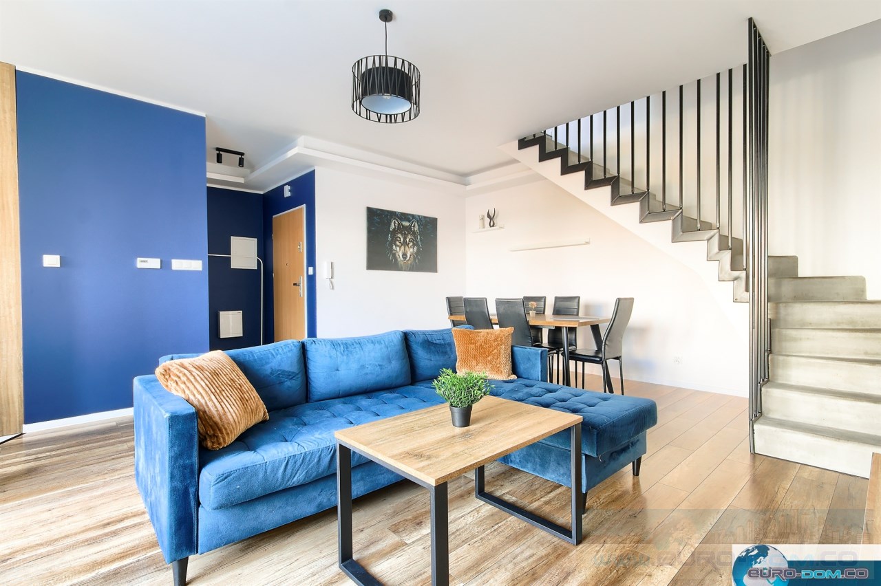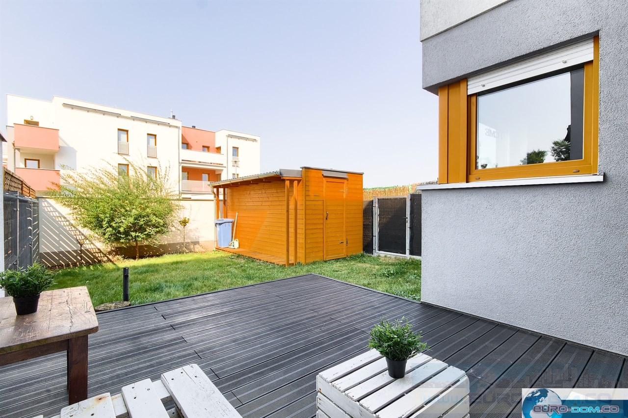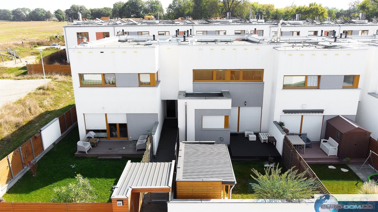 Szeregowiec o łącznej powierzchni 75 m2 w skład którego wchodzi przestronny salon, kuchnia i WC na parterze oraz dwie sypialnie z łazienką na piętrze. Do jednej z sypialni przynależy duża garderoba, co zapewnia duży komfort. Atutem nieruchomości jest duży ogródek, do którego jest wejście z salonu. Mieszkanie jest jasne dzięki dużym oknom, a w każdym oknie na parterze są zamontowane rolety zewnętrzne, co zapewnia komfort w upalne dni ale i prywatność. Kuchnia jest wyposażona we wszystkie niezbędne sprzęty AGD (zmywarka, piekarnik, płyta indukcyjna, okap). W salonie mamy wygodny narożnik i wyznaczoną jadalnie ze stołem i krzesłami. W jednej z sypialni znajduje się duże łóżko małżeńskie, a w drugiej rozkładana kanapa.