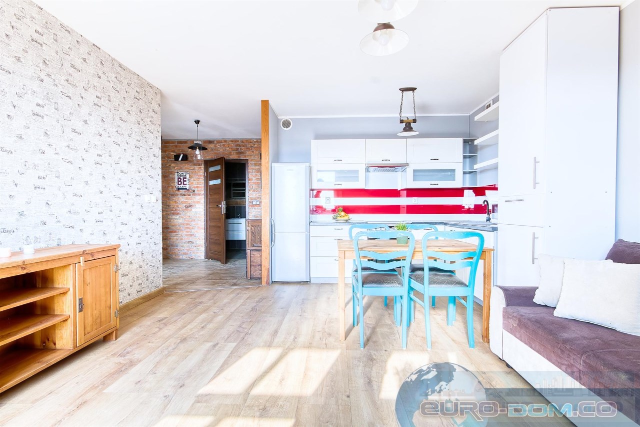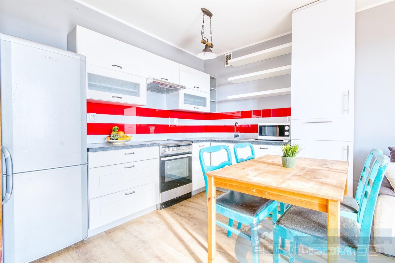 W pełni wyposażona kuchnia (sprzęty AGD zmywarka, płyta grzewcza, piekarnik, lodówka z zamrażalnikiem) połączona z salonem w skład, którego wchodzi zestaw wypoczynkowy, szafka RTV z miejscem na telewizor. W salonie znajduję się również stół z 4 krzesłami. Całość nowoczesna, estetyczna i komfortowa.