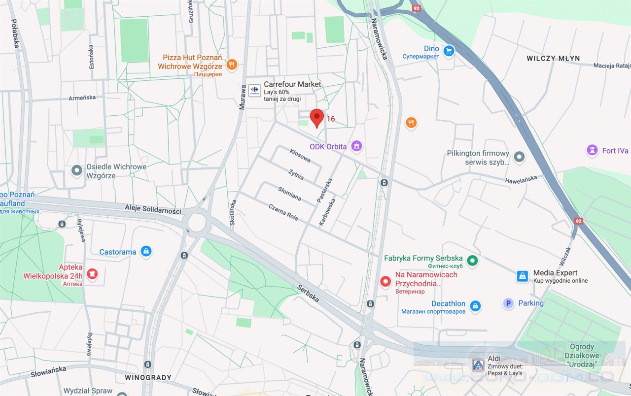 Lokal znajduje się w zadbanym, wielopiętrowym bloku mieszkalnym na osiedlu Kosmonautów w Poznaniu. Budynek jest ocieplony, wyposażony w windę oraz domofon, a wokół niego dostępne są liczne miejsca parkingowe. Osiedle charakteryzuje się bardzo dobrą infrastrukturą – w najbliższym otoczeniu znajdują się sklepy spożywcze, punkty usługowe, przychodnia, szkoły oraz przedszkola. Blisko jest również do terenów zielonych, co zapewnia komfort i możliwość wypoczynku. Atutem lokalizacji jest świetna komunikacja – w pobliżu znajdują się przystanki autobusowe i tramwajowe, co umożliwia szybki dojazd do centrum miasta i innych dzielnic Poznania.