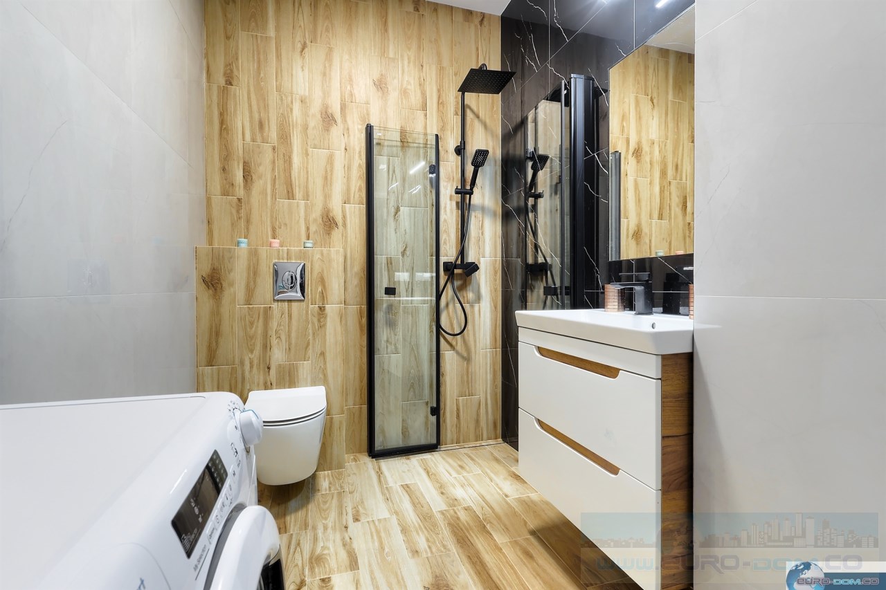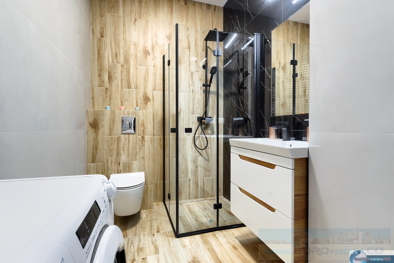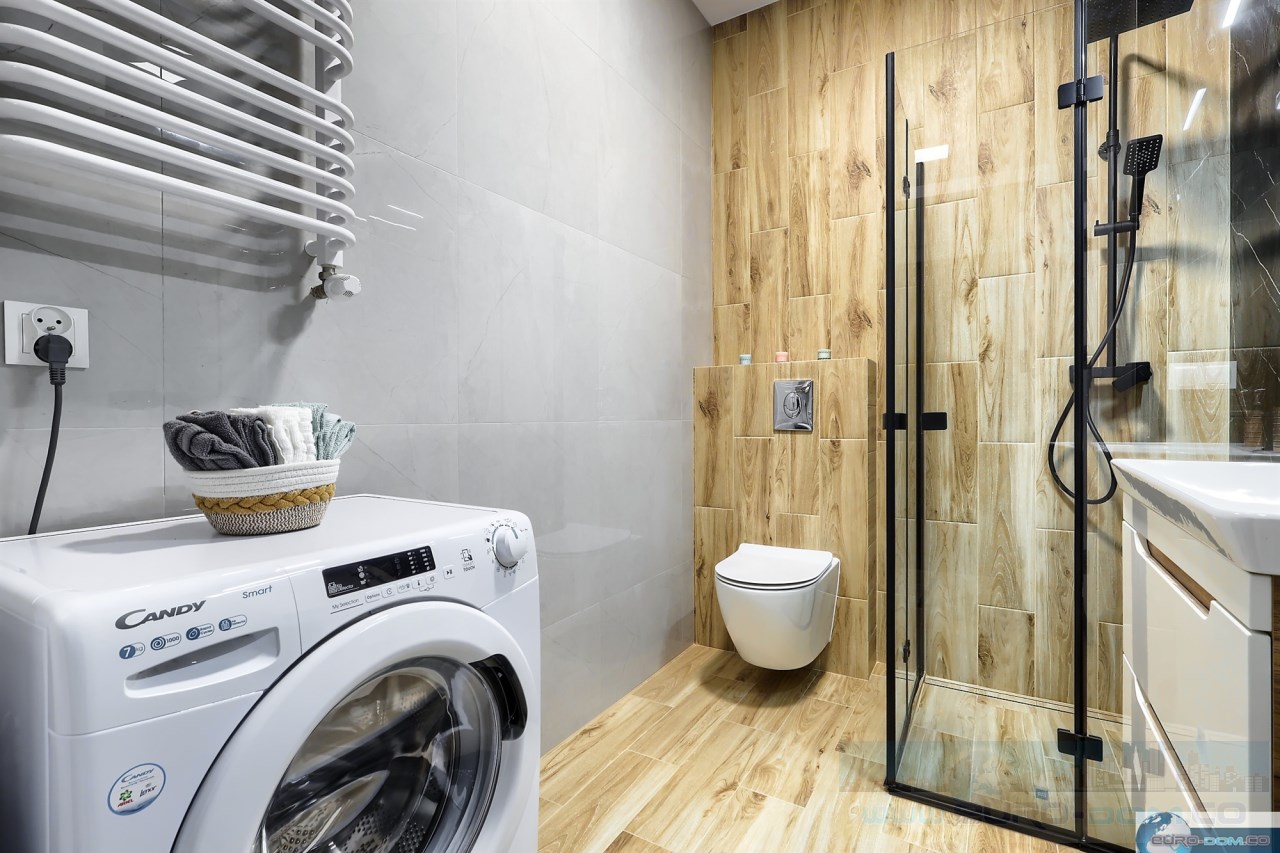 Elegancko wykończona łazienka. Wyposażona w prysznic typu walk-in, toaletę, umywalkę i pralkę