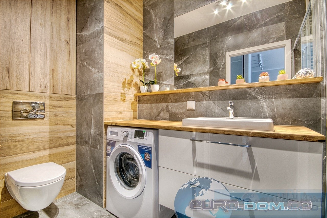 Łazienka – zaprojektowana z myślą o komforcie: nowoczesny prysznic Walk-in z odpływem liniowym, duże lustro, dwie szafki do przechowywania, pralka oraz WC.