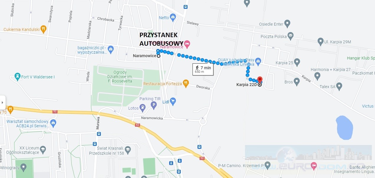 Mieszkanie zlokalizowane jest na poznańskim osiedlu Naramowice, na ulicy Karpia. W okolica bogata jest w rozwiniętą infrastrukturę handlowo-usługową, znajdują się tam zarówno sklepy, szkoły jak i restauracje. Kilka minut spacerem dzieli lokal od przystanków - autobusowego - linie nr. 169, 167, 911, 147 oraz tramwajowego - linia nr. 3, dzięki nim z łatwością można dostać się do innych części miasta. Lokalizacja sprawdzi się idealnie dla osób ceniących spokój oraz bliskość natury jak i prowadzących aktywne życie zawodowe lub uczelniane.