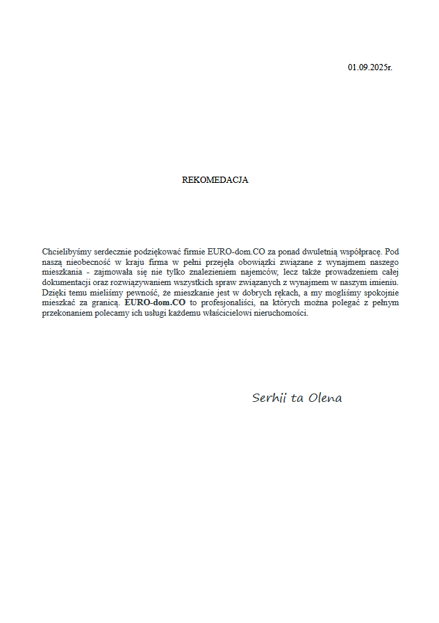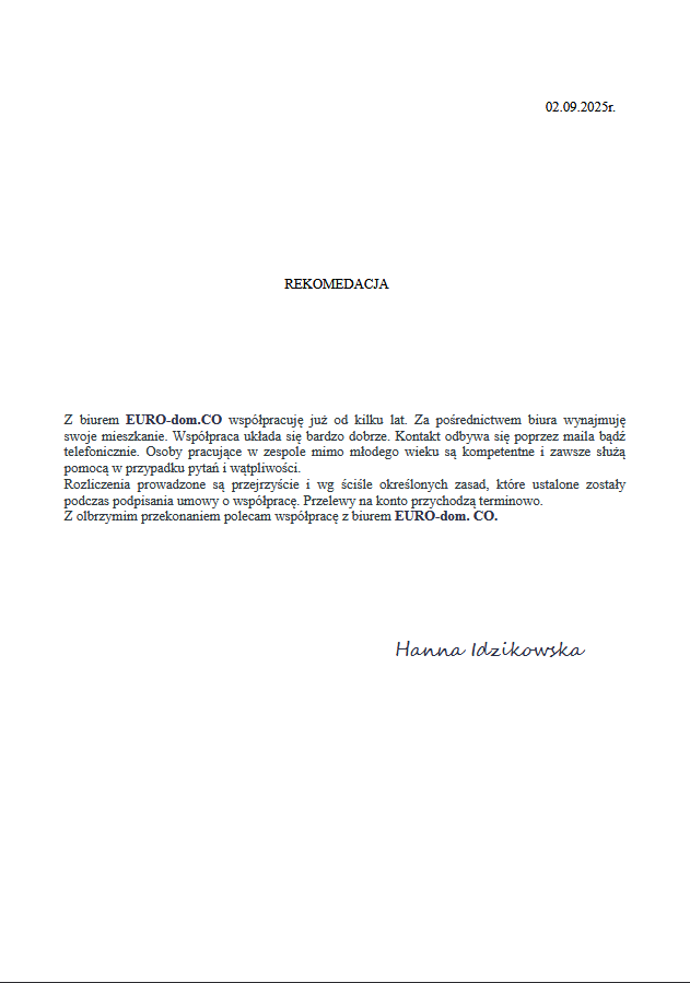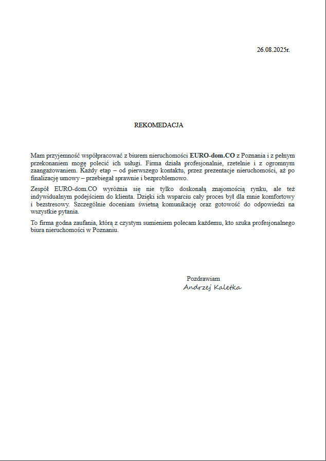 Chcielibyśmy serdecznie podziękować za wszystkie pozytywne opinie i referencje, które wystawiliście dla naszej agencji nieruchomości EURO-dom. Wasze zaufanie i wsparcie są dla nas niezmiernie ważne i motywują nas do jeszcze większego zaangażowania w naszą pracę.