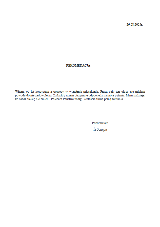 Dzięki Waszym rekomendacjom możemy kontynuować naszą misję pomagania w znalezieniu wymarzonych domów i mieszkań dla naszych Klientów. Jesteśmy wdzięczni za każde słowo uznania i obiecujemy, że będziemy dalej dążyć do doskonałości w świadczeniu naszych usług.