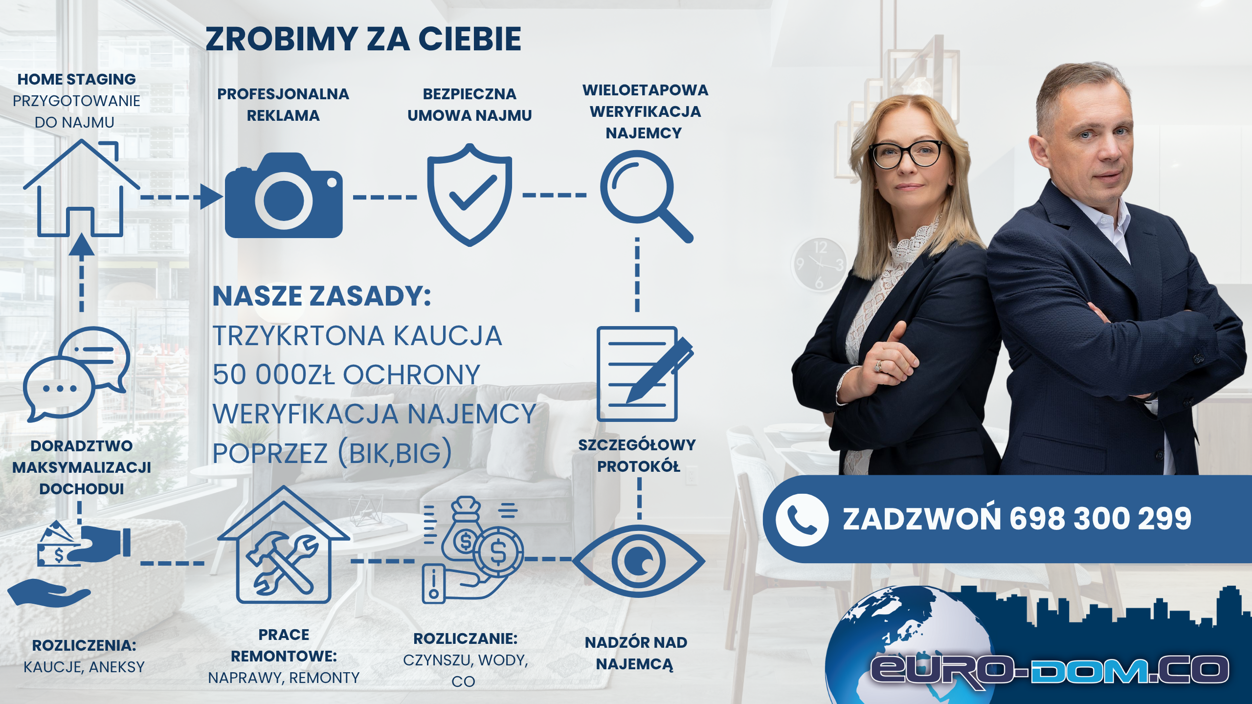 Zespół pracowników Biura Nieruchomości EURO-dom.CO, z myślą o Twojej wygodzie, oszczędności czasu oraz maksymalizacji bezpieczeństwa wynajmu, przygotował NAJLEPSZĄ ofertę zarządzania nieruchomością na polskim rynku. Oferta opiera się na kilkunastoletnich doświadczeniach w obszarach: nieruchomości, prawa, podatków, ubezpieczeń i nie tylko.